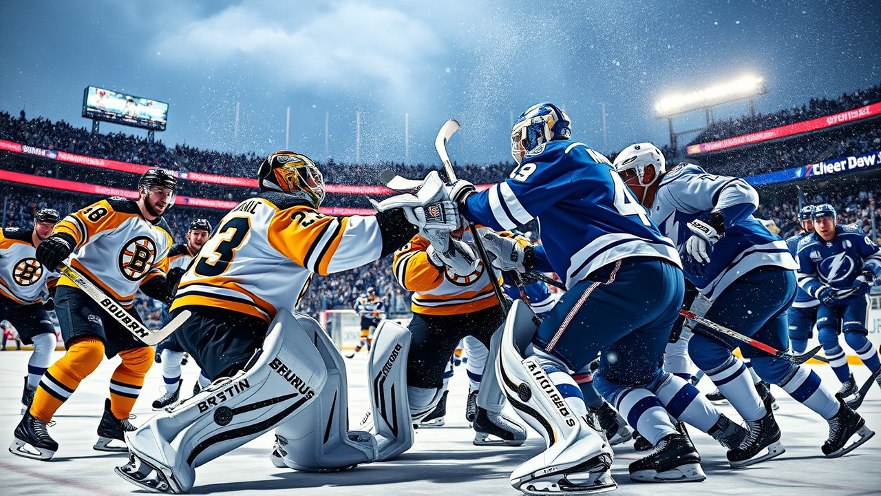 Le premier match en extérieur de l’histoire de Tampa a offert un moment mémorable : un combat de gardiens. Jeremy Swayman des Boston Bruins et Andrei Vasilevskiy des Tampa Bay Lightning se sont affrontés au cours de la deuxième période, alors que Boston menait 5-2 et que les tensions étaient palpables.