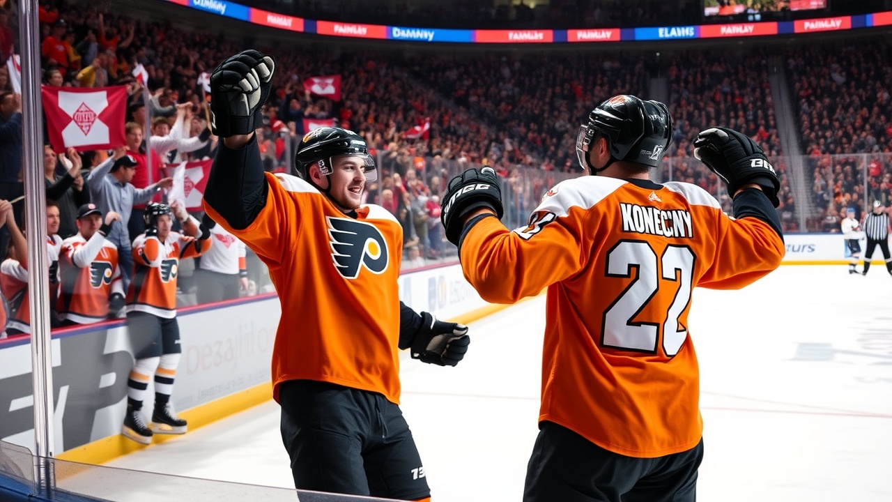 Konecny, célébrant son 29e anniversaire, a reçu une passe de Travis Sanheim dans le cercle droit et a marqué contre Logan Thompson des Capitals à 4:23 de la deuxième période, égalisant le score à 1-1. Owen Tippett a ensuite intercepté une passe, a contourné Tom Wilson des Capitals et a filé en 2 contre 0 avec Zegras. Les deux joueurs ont échangé la rondelle avant que Zegras ne soulève le palet pour donner l’avantage aux Flyers, 2-1.
