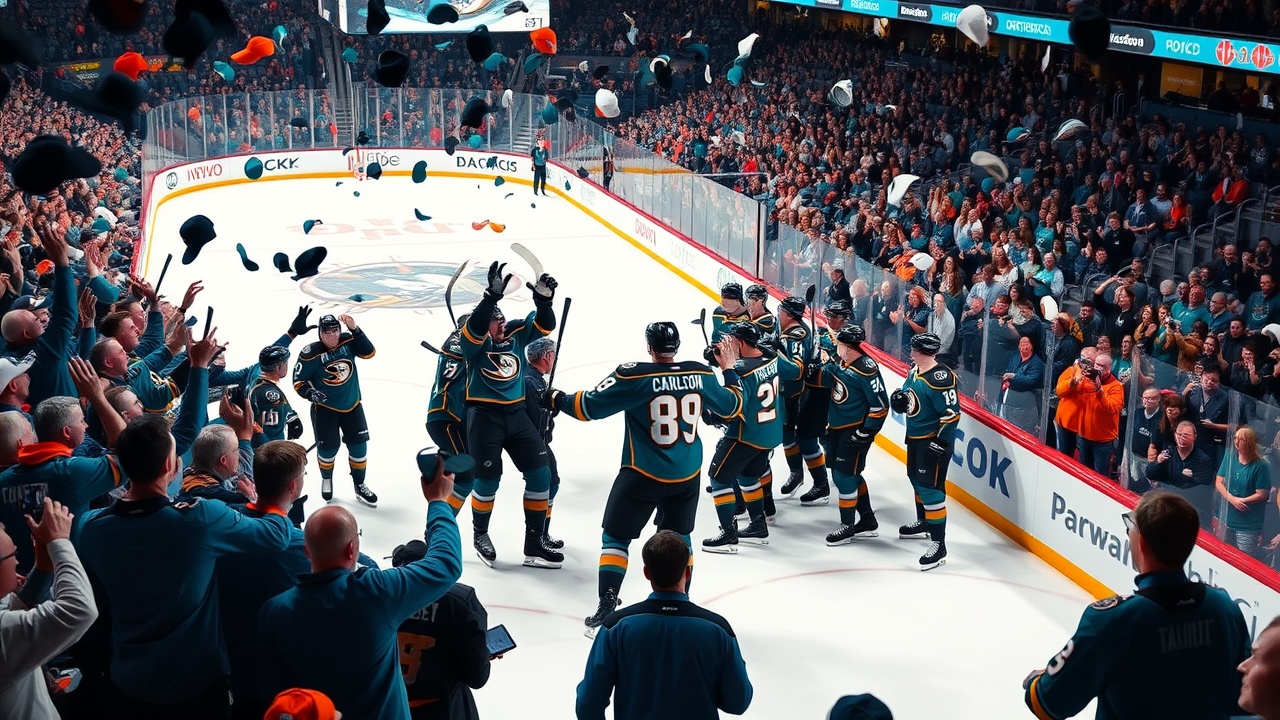 ANAHEIM, Californie (AP) — John Carlson a inscrit trois buts, réalisant ainsi le premier hat trick de sa carrière après 17 ans en NHL. Les Anaheim Ducks ont mis fin à leur série de six défaites en s’imposant de manière convaincante 6-1 contre les San Jose Sharks, jeudi soir. Leo Carlsson, Alex Killorn et Frank Vatrano ont également marqué, tandis que Beckett Sennecke a enregistré deux passes décisives pour les Ducks, qui ont pris une avance de 4-0 et ont dominé leurs rivaux de la division Pacifique, enregistrant leur première victoire depuis le 26 mars.