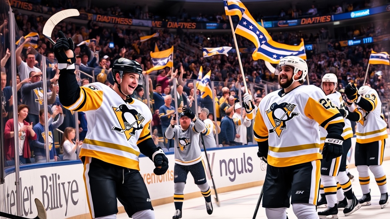 Avery Hayes, numéro 85 des Pittsburgh Penguins, célèbre avec ses coéquipiers après avoir marqué son premier but en carrière lors de la première période d’un match de la LNH contre les Buffalo Sabres au KeyBank Center, le 5 février 2026. (Photo par Joe Hrycych/Getty Images)