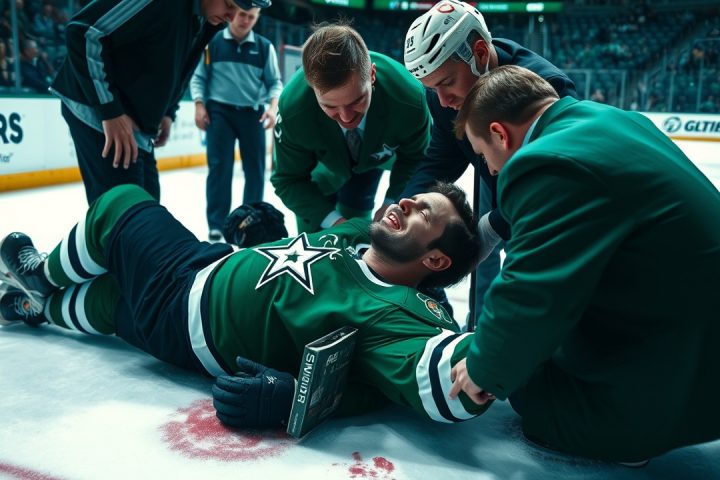 American Airlines Center·Carolina·Dallas Stars·Glen Gulutzan·Hockey· Le capitaine des Dallas Stars, Jamie Benn, reçoit des points de suture après une blessure au visage sur la glace et pourrait manquer les prochains matchs janvier 5, 2026 Editor Incident de Jamie Benn 4 janvier 2026 ; Dallas, Texas, USA ; Le joueur de gauche…